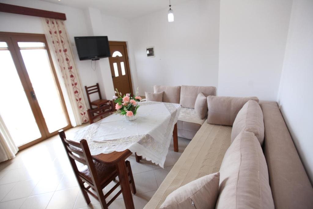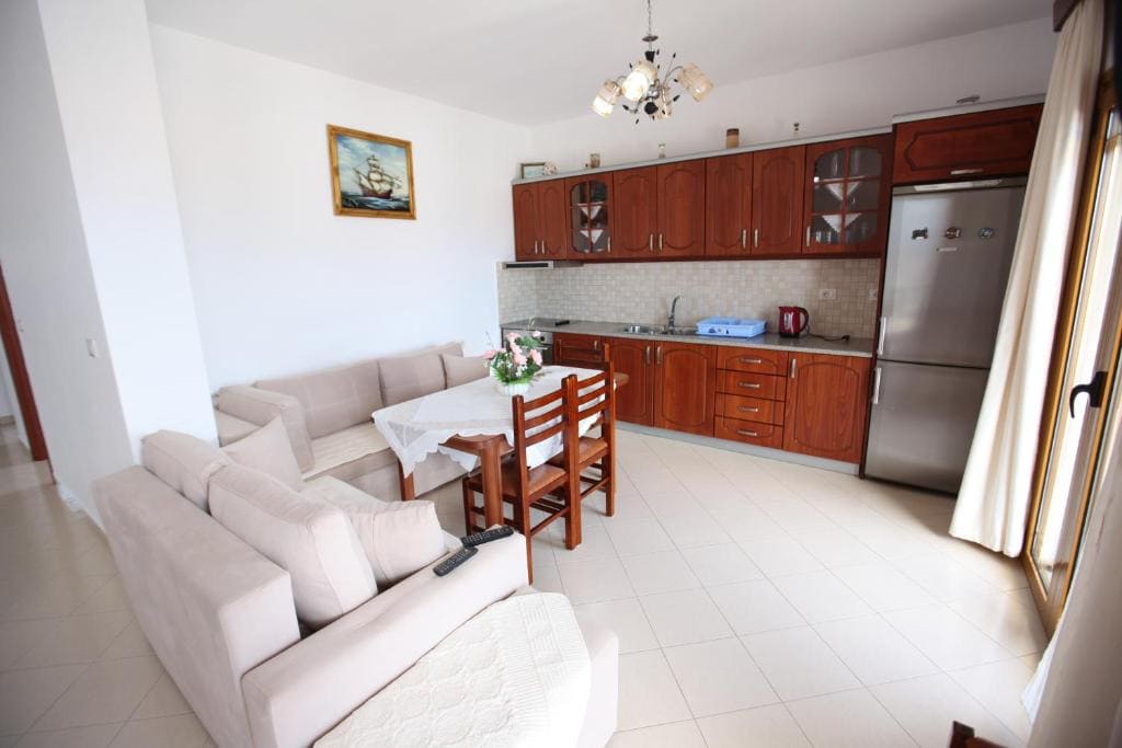 Ky apartament i gjerë përbëhet nga 1 dhomë ndenjeje, 2 dhoma gjumi të veçanta dhe 1 banjo me dush dhe tualetin falas. Guests do të gjeni një sobë, një frigorifer, enë gatimi dhe një furrë në kuzhinë. Apartamenti ka edhe Barbecue. Apartamenti me ajër të kondicionuar ofron një TV me ekran të sheshtë me kanale kabllore, një aparat për çaj dhe kafe, një zonë të shtrojë, një zonë ngrënie si dhe pamje nga deti. Njësia ofron 3 krevate.